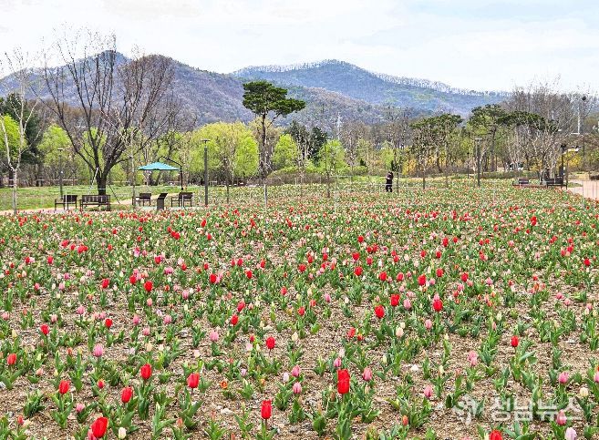 천안의 대표 명소인 삼거리공원 너른뜰 튤립정원에 10만 송이의 튤립이 꽃망울을 터트리며 시민들에게 봄의 설렘을 전하고 있다.