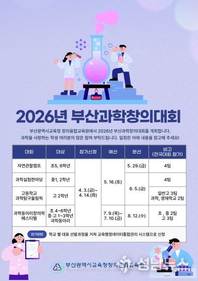 부산광역시교육청창의융합교육원은 오는 14일까지 과학 분에야 재능과 관심이 있는 부산 지역 초·중·고등학생을 대상으로 ‘2026년 부산과학창의대회’ 참가 신청을 받는다고 8일 밝혔다.