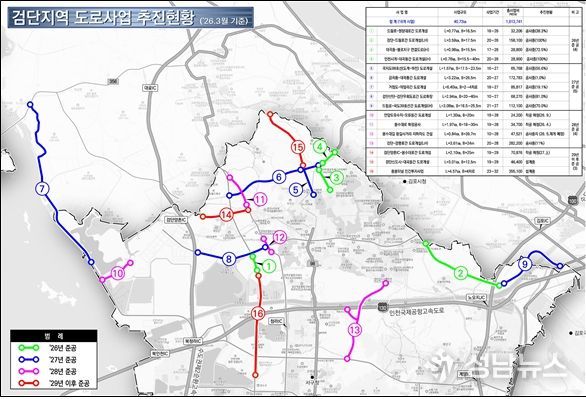 첫째, 검단지역에서는 검단양촌IC~봉수대로, 금곡동~대곡동 구간 등 총 16개 도로사업이 추진된다. 총연장 40.73km, 사업비는 약 1조 6,137억 원에 달한다.