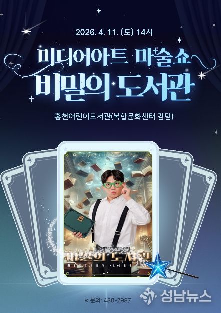 홍천 어린이도서관은 도서관의 날(4월 12일)을 기념하여 4월 11일 토요일 홍천 복합 문화센터 강당에서 미디어 아트 마술쇼 '비밀의 도서관'을 선보인다.