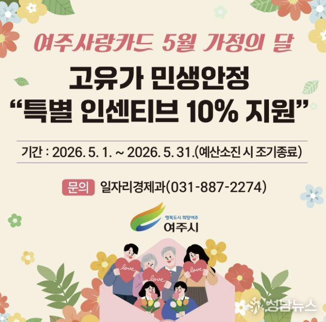여주시는 최근 중동 정세 악화에 따른 물가상승 압력이 높아짐에 따라 민생안정 대책으로 오는 5월 가정의 달 ‘여주사랑카드 특별 인센티브 10%’ 지원을 한다고 밝혔다.