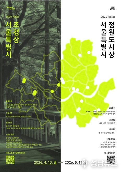 서울시는 도시경관 개선에 기여한 우수 조경공간과 시민참여 정원 사례를 발굴·확산하기 위해 '2026 서울특별시 조경상·정원도시상' 공모를 4월 13일부터 5월 13일까지 진행한다고 밝혔다.