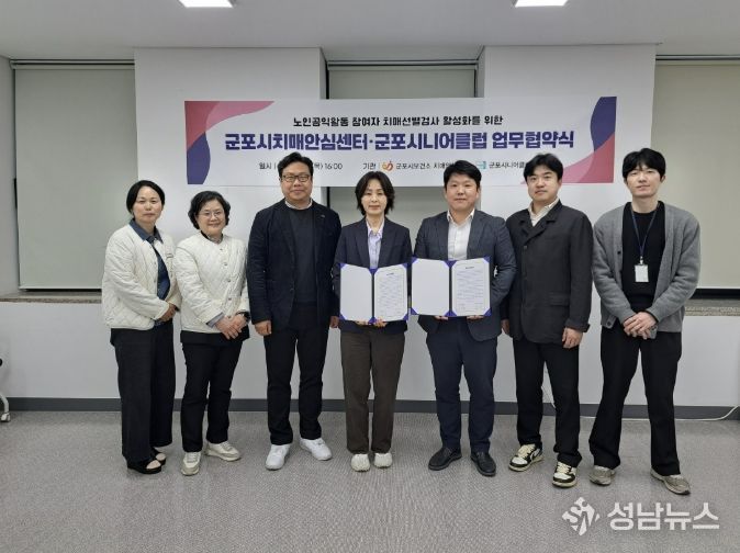 군포시치매안심센터는 4월 9일 군포시시니어클럽과 업무협약을 체결하고 노인공익활동 참여자를 대상으로 한 치매선별검사 확대에 나선다고 밝혔다.