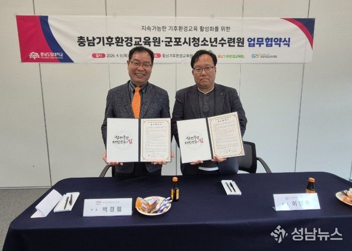 (재)군포시청소년재단이 운영하는 군포시청소년수련원(충남 청양)과 충남기후환경교육원(충남 청양)은 4월 9일, 미래세대의 지속가능 기후환경교육 활성화를 위한 업무협약을 체결했다고 전했다.