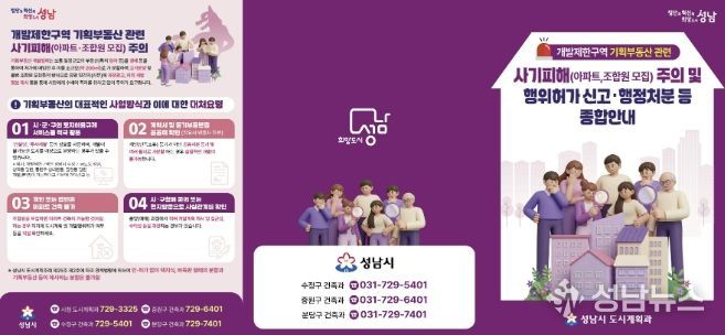 성남시는 최근 개발이 불가능하거나 제한적인 개발제한구역(그린벨트) 내 토지를 곧 해제될 것처럼 속여 고가에 판매하는 이른바 ‘기획부동산’ 사기가 증가함에 따라 시민 주의를 당부하고, 안내문을 제작·배부한다고 밝혔다.