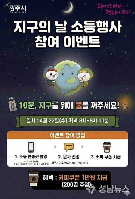 광주시는 제56주년 지구의 날(4월 22일)을 기념해 당일 10분간 진행하는 소등 행사와 연계한 시민참여 온라인 행사를 추진한다고 14일 밝혔다.