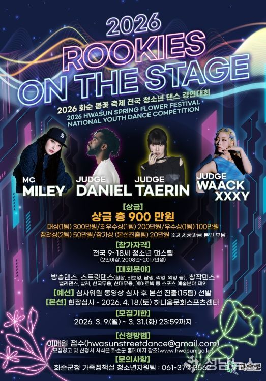 화순군은 오는 4월 18일 '2026 화순 봄꽃 축제'의 화려한 시작을 알리는 ‘제3회 전국 청소년 댄스 경연 대회’ 본선을 개최한다고 밝혔다.