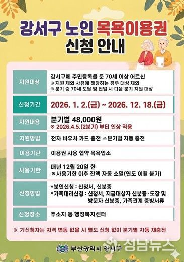 노인 목욕이용권 지원사업은 부산에서 최초로 시행된 노인복지사업으로, 주민등록상 강서구에 거주하는 70세 이상 어르신을 대상으로 월 2회 목욕이용권(바우처)을 지원하는 사업이다. 해당 사업은 지난 2023년 7월부터 시행돼 어르신 복지 증진에 기여해 왔다.