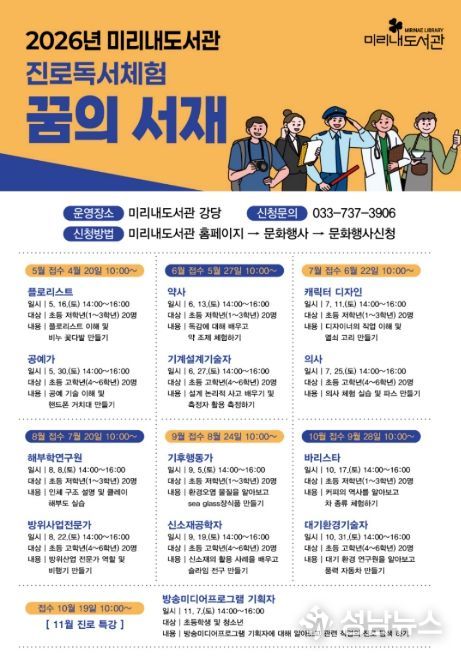 원주시 미리내도서관은 관내 학생들의 자기 주도적 진로 탐색을 돕기 위해 5월 9일부터 11월 7일까지 미리내도서관과 샘마루도서관에서 진로 독서 체험 프로그램 ‘꿈의 서재’를 운영한다.