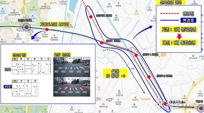아울러 상지석 교차로부터 설문나들목(IC) 구간까지는 기존 2개로 운영되던 신호 연동체계를 1개 그룹으로 통합하여 출근시간에는 나들목(IC) 방향, 퇴근시간에는 신도시 방향 중심으로 교통 흐름이 원활히 유지되도록 최적화할 방침이다.