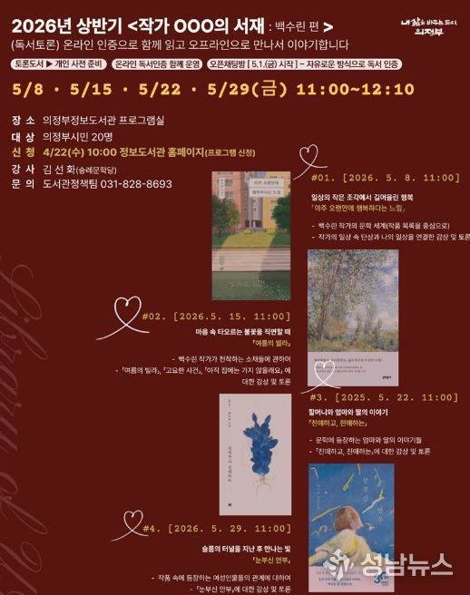 의정부시는 2026년 상반기 ‘작가 OOO의 서재: 백수린 편’을 5월 매주 금요일(8일, 15일, 22일, 29일) 총 4회에 걸쳐 의정부정보도서관에서 운영한다.