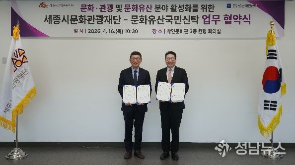 이날 협약식에는 박영국 세종시문화관광재단 대표이사와 이상현 문화유산국민신탁 이사장이 참석해, 양 기관 협력 강화를 통한 문화·관광 및 문화유산 분야 발전과 시민 문화 향유 기회 확대에 뜻을 모았다.