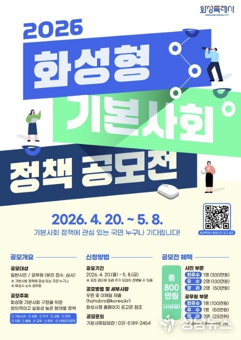 화성특례시는 시민 참여 기반을 확대하고, 실효성 있는 기본사회 정책을 발굴하기 위해 '2026년 화성형 기본사회 정책 공모전'을 개최한다고 밝혔다.