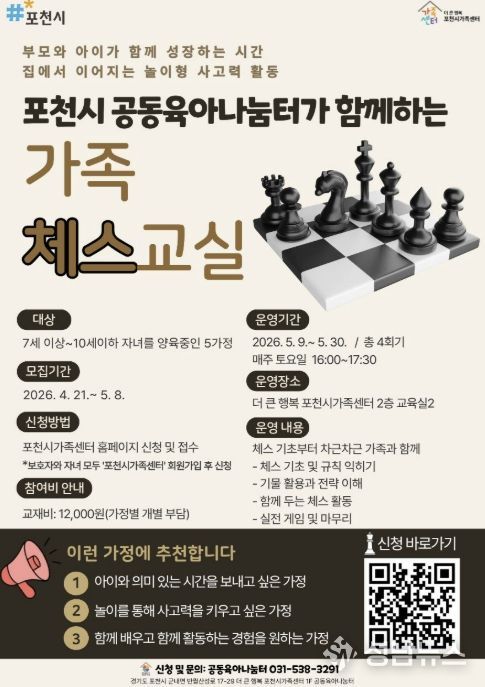 센터장은 “체스는 사고력과 집중력을 키울 수 있는 대표적인 활동으로, 부모와 자녀가 함께 참여할 때 그 효과가 더욱 커진다”며 “프로그램을 통해 많은 가정이 함께 배우고 즐기는 의미 있는 시간을 보내길 바란다”고 밝혔다.