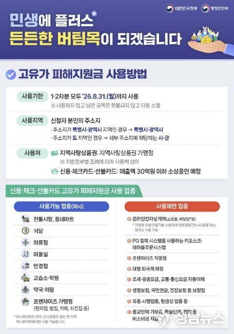 송무경 공주시장 권한대행은 “고유가 상황의 장기화로 시민과 소상공인의 부담이 지속적으로 증가하고 있는 만큼, 이번 지원이 실질적인 도움이 되도록 신속하고 정확하게 사업을 추진하겠다”며 “지원금이 지역 내 소비로 이어져 골목상권 활성화에도 기여할 것으로 기대한다”고 밝혔다.