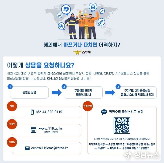 홍성소방서는 해외에서 예기치 못한 질병이나 부상 발생 시 신속한 대응을 돕기 위해 ‘재외국민 119응급의료 상담서비스’ 이용을 홍보한다고 밝혔다.