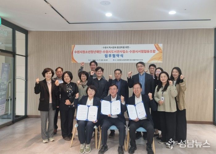수원시 도서관사업소와 수원시청소년청년재단, 수원시서점협동조합이 지역 독서문화 활성화와 시민 독서활동 증진을 위해 협력하기로 했다.