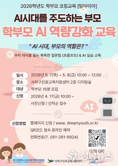 사하구진로교육지원센터는 오는 5월 7일부터 5월 8일까지 양일간 학부모를 대상으로 'AI 시대, 부모의 역할은?' 특강을 운영한다.
