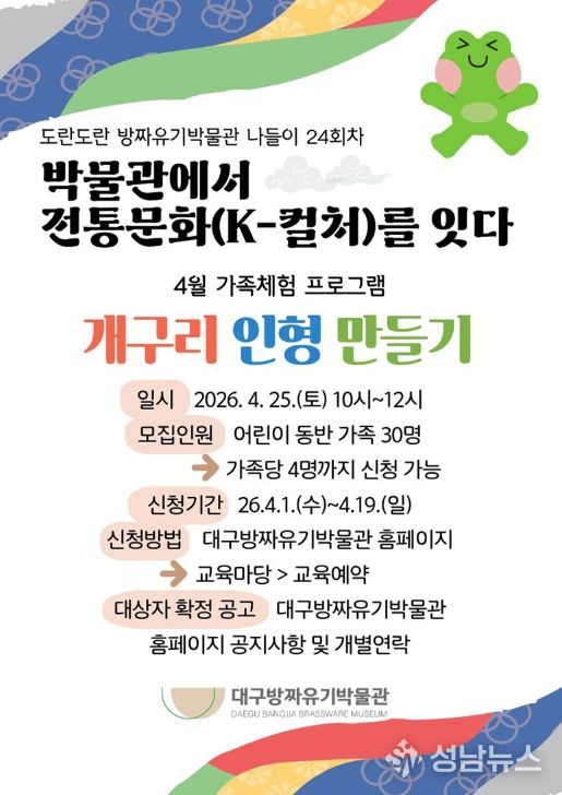 대구문화예술진흥원 박물관운영본부 소속 대구방짜유기박물관은 화창한 봄날 4월에 전통공예 가족체험과 팔공산 역사문화 이해 특강을 기획하여, 4월 25일 오전 10시에 ‘개구리 인형 만들기’ 체험을, 4월 28일 오후 2시에 ‘고려 태조 왕건 후백제 견훤과 팔공산’ 강의를 개최한다.