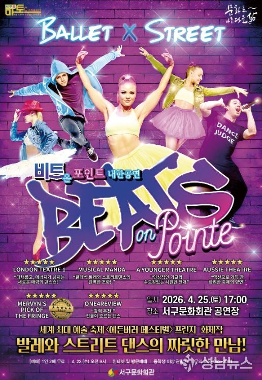 서구문화회관은 4월 25일 오후 5시 서구문화회관 공연장에서 4월 서구愛 마토콘서트로 댄스 퍼포먼스'비트 온 포인트'내한 공연을 개최한다.