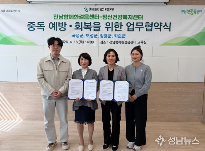 화순군은 지난 16일 화순군정신건강복지센터가 전남함께한걸음센터와 지역사회 마약류 및 약물 오남용 예방과 회복 지원 강화를 위한 업무협약(MOU)을 체결했다고 밝혔다.