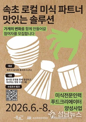 한편, 사업은 속초시 소재 음식업 소상공인 10개소 내외를 대상으로 추진될 예정이다. 선정된 사업장에는 시그니처 메뉴 개발 또는 기존 메뉴 개선, 조리 공정 및 운영 효율화, 서비스 개선 등 맞춤형 컨설팅이 지원된다. 아울러 컨설팅 과정에서 도출된 결과를 공유하는 성과공유회와 사업 과정 기록, 아카이빙도 함께 추진해 지역 음식점의 변화 사례를 확산할 계획이다.