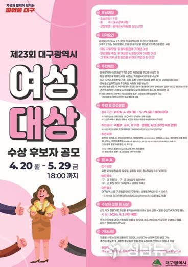 대구광역시는 여성의 지위 향상과 양성평등 실현에 공헌한 여성 인재를 발굴·격려하기 위해 ‘2026년 제23회 대구광역시 여성대상’ 수상 후보자를 4월 20일부터 5월 29일까지 공개 모집한다.