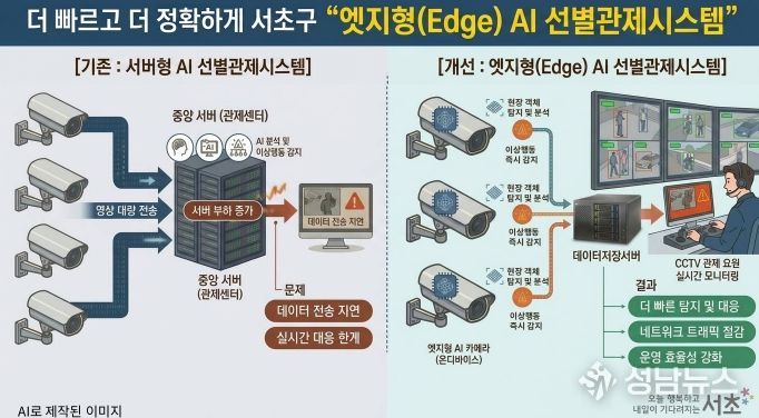 서울 서초구가 전국 최초로 ‘엣지형 AI 선별관제시스템’을 도입해 본격 운영에 나선다고 밝혔다. AI 카메라가 현장에서 영상을 직접 분석한 뒤 선별된 정보를 관제센터로 전송하는 방식으로, 범죄·재난 등 비상상황 대응 속도와 관제 효율을 높인다는 계획이다.