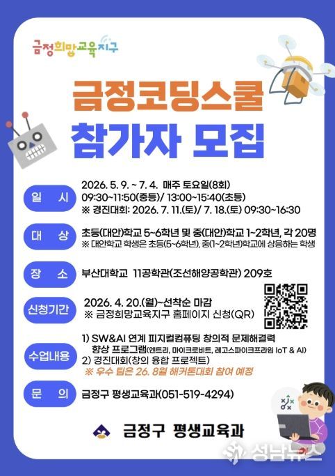 부산 금정구는 초‧중학생을 대상으로 인공지능(AI) 및 소프트웨어(SW) 교육 프로그램인 녪금정 코딩스쿨’을 운영한다고 밝혔다.