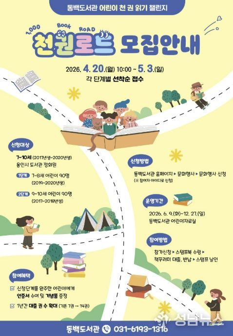 용인특례시 동백도서관은 어린이 천 권 읽기 챌린지 ‘천권로드(ROAD)’ 참여자를 모집한다고 20일 밝혔다.