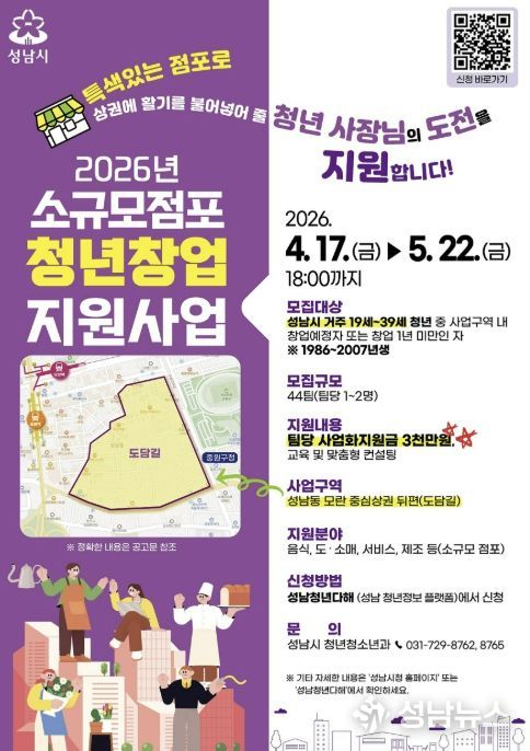 대상은 성남시 거주자이면서 도담길에 창업을 희망하는 19~39세 청년 또는 창업 1년 미만인 청년이다. 신청은 1~2명의 팀 단위로 할 수 있다.