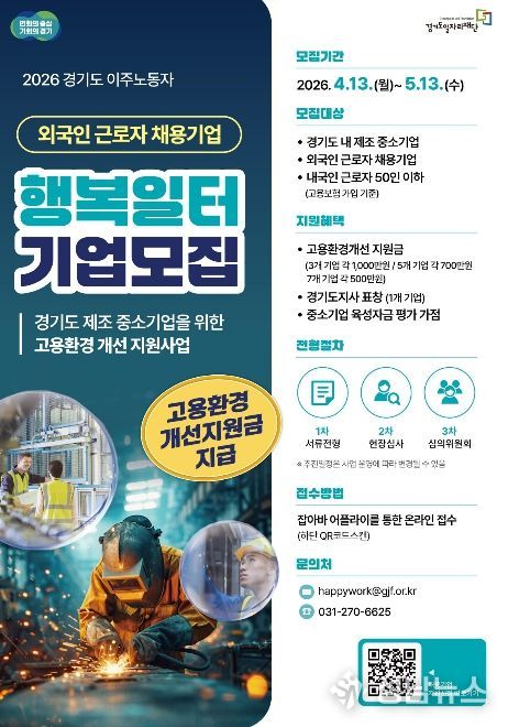 경기도와 경기도일자리재단은 도내 외국인 근로자를 고용한 중소 제조기업을 대상으로 ‘2026년 경기도 이주노동자 행복일터 선정사업’ 참여기업을 모집한다고 20일 밝혔다.