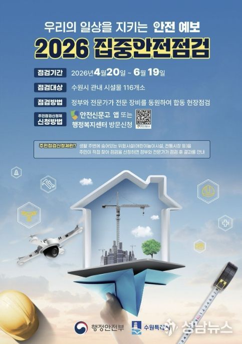 수원특례시가 안전사고를 예방하고, 시민의 안전 의식을 고취하기 위해 20일부터 6월 19일까지 ‘2026년 집중안전점검’을 한다.