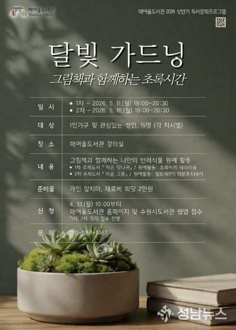 수원시 매여울도서관이 그림책 읽기와 식물 가드닝을 결합한 체험형 프로그램 ‘달빛 가드닝, 그림책과 함께하는 초록시간’을 운영한다.