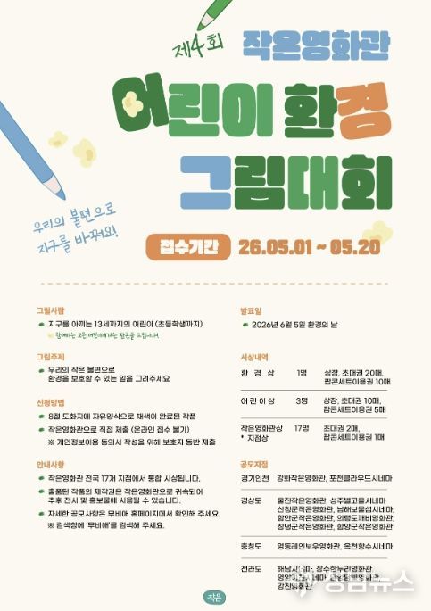 산청군 관계자는 “아이들의 순수한 시선으로 환경 보호의 가치를 그려내는 의미 있는 시간이 될 것”이라며 “전국 단위 시상과 함께 참여만 해도 팝콘 선물을 받을 수 있는 만큼 많은 참여 바란다”고 말했다.