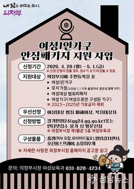 의정부시는 4월 20일부터 5월 1일까지 12일간 온․오프라인을 통해 여성 1인 가구 안심패키지 지원사업의 신청을 접수한다.