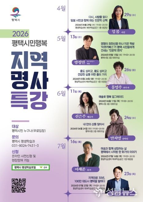 한편 모든 강좌는 4월 20일부터 평택시 평생학습 포털 및 전화로 사전 신청할 수 있으며, 일부 잔여 좌석에 한해 현장 참여도 가능하다. 평택시는 이번 지역 명사 특강을 통해 시민의 지식 성장을 지원하고, 열린 평생학습 문화 조성을 더욱 강화할 계획이다.