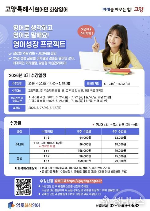 고양특례시는 글로벌 역량 강화와 사교육비 부담 완화를 위한 ‘원어민 화상영어’ 프로그램의 3기 수강생을 4월 20일부터 5월 15일까지 모집한다.