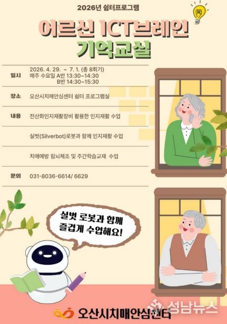 오산시치매안심센터는 오는 4월 29일부터 경증 치매환자를 위한 쉼터 프로그램 ‘ICT 브레인 기억 교실’을 운영한다고 밝혔다.