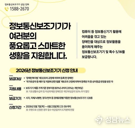 신청은 5월 7일부터 6월 23일까지 정보통신보조기기 누리집을 통한 온라인 접수 또는 자치구 방문, 우편으로 가능하다. 대상자는 장애 정도와 소득 수준, 기존 지원 이력 등을 종합적으로 고려해 선정된다.