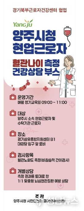 양주시가 현업근로자의 건강 증진과 뇌심혈관계질환 예방을 위해 오는 4월 22일부터 연말까지 ‘찾아가는 근로자 건강상담 부스’를 운영한다.