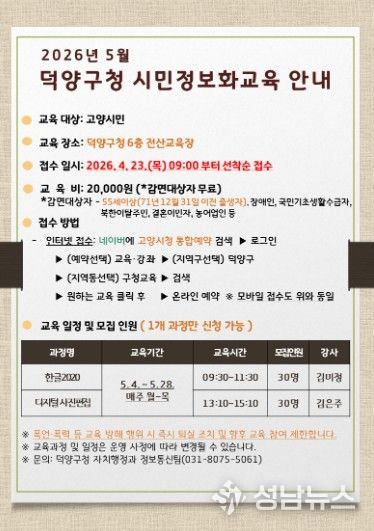 교육은 5월 4일부터 28일까지 덕양구청 전산교육장에서 진행되며, 수강 신청은 4월 23일 오전 9시부터 덕양구청 통합예약 누리집을 통해 온라인으로 접수할 수 있다.