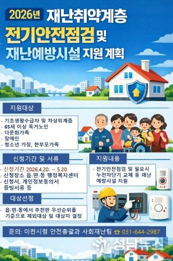 이천시는 전기설비 노후화 등으로 인한 화재와 안전사고를 예방하고 재난취약계층의 주거 안전을 강화하기 위해 ‘재난취약계층 전기안전점검 및 재난예방시설 지원사업’을 추진한다고 밝혔다.