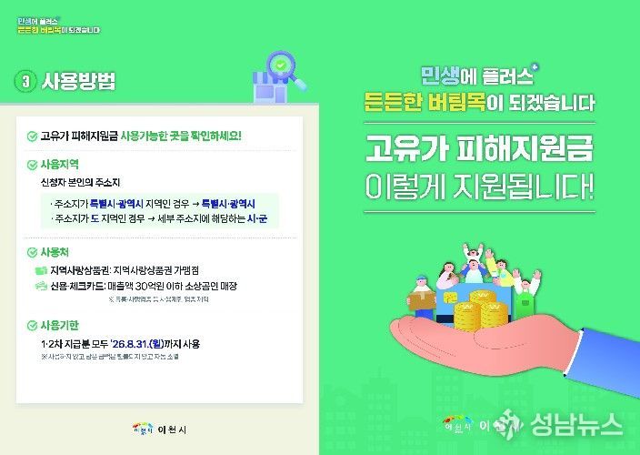 1인당 지원 금액은 기초생활수급자 55만 원, 차상위계층 및 한부모가족 45만 원, 소득 하위 70% 시민은 10만 원이다. 신청은 온라인과 오프라인 모두 가능하다. 신용·체크카드는 해당 카드사 누리집 또는 앱, 콜센터를 통해 신청하거나 카드 연계 은행 영업점을 방문해 신청할 수 있으며, 지역화폐는 전용 앱 또는 읍면동 행정복지센터 방문을 통해 신청할 수 있다.