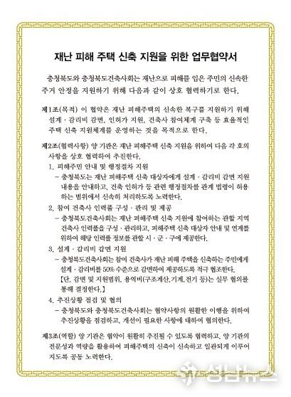 협약에 따라 도는 신속한 인·허가 등 관련 행정절차 처리를 협조하고, 충북건축사회는 설계·감리비의 최대 50% 수준 감면 및 전문 지원체계 구축 등 피해 도민은 즉각적인 기술 자문과 설계를 지원받을 수 있는 체계를 운영한다.