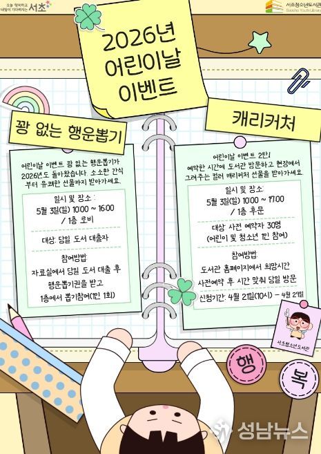 서울 서초구는 다가오는 어린이날을 맞아 다음달 3일 서초청소년도서관에서 어린이와 가족 모두가 즐길 수 있는 특별한 문화 행사를 개최한다. 이용자들을 위한 이벤트를 중심으로 일상 속 친숙한 도서관 만들기의 일환이다.