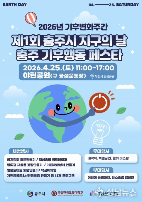 충주시는 25일 오전 11시 야현공원(구 공설운동장) 일원에서 ‘2026년 기후변화주간’을 기념해 ‘제1회 충주시 지구의 날’ 행사를 개최한다고 21일 밝혔다.
