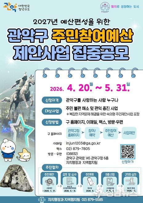 관악구가 지역사회 문제를 해소하고 주민 편익을 증진하기 위해 ‘2026년도 주민참여예산사업 및 협치의제’ 공모를 실시한다.