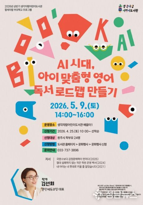 원주시 생각자람어린이도서관은 다음 달 9일 오후 2시, ‘AI 시대, 아이 맞춤형 영어 독서 로드맵 만들기’를 주제로 5월 ‘함께자람 부모학교’ 프로그램을 운영한다.