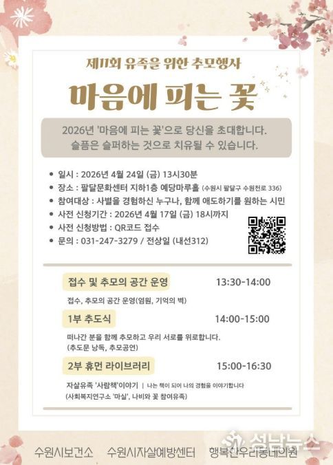수원시자살예방센터가 24일 오후 1시 30분 팔달문화센터 예당마루홀에서 유족을 위한 추모행사 ‘제11회 마음에 피는 꽃’을 연다.